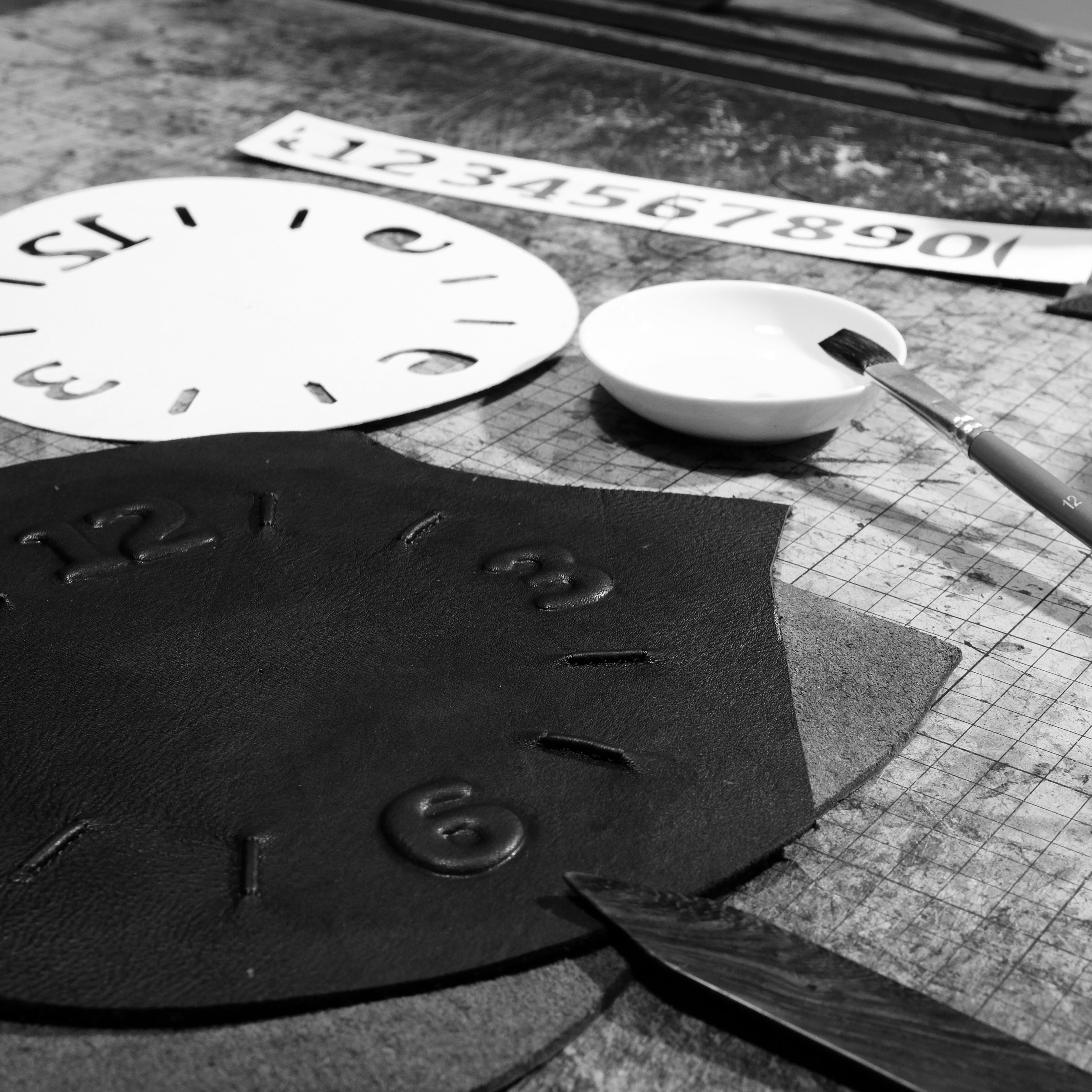 オールレザーのウォールクロック、文字盤はレザーのみでつくられています。
